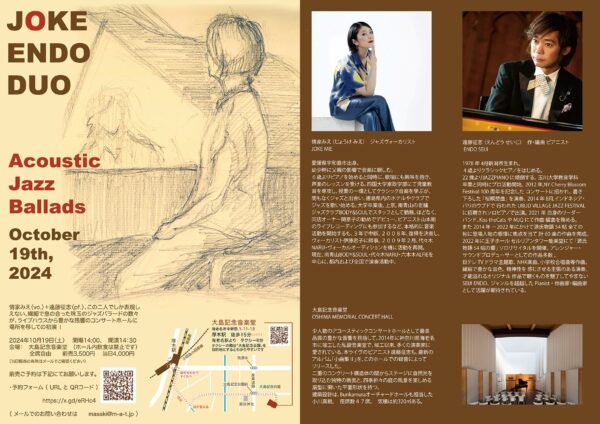 設計した大島記念音楽堂でのジャスコンサートを主催しました。演者は、小川が大ファンのボーカルの情家みえさんとピアノの遠藤征志さん。フライヤーのデザインは私。都内のライブハウスでお二人をスケッチしたものです。